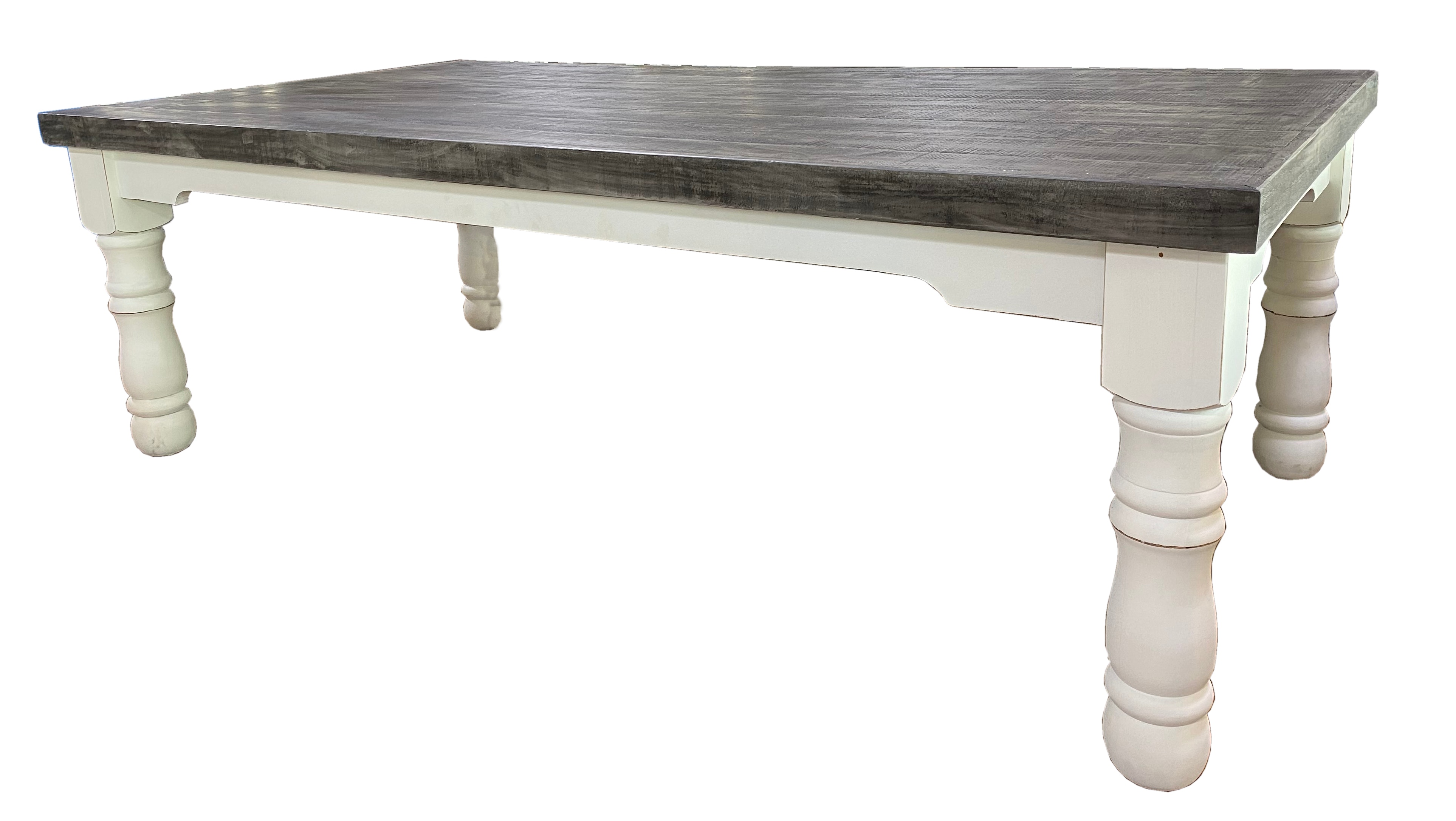 White, stylized boards combined with a rustic top.there are also two additional shelves.